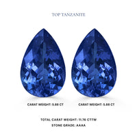 Top Tanzanite is a mine-to-market brand known for ethically sourced, high-quality natural Tanzanite gemstones. This certified matched pair features Pear Shape stones measuring 12.00x8.00mm each, with a total weight of 11.76cttw (5.88ct per stone). Graded AAAA, these Tanzanites showcase a vivid violet-blue color and exceptional clarity. Perfect for custom earrings, fine jewelry, or a thoughtful anniversary or engagement gift, this pair reflects expert craftsmanship, authenticity, and timeless elegance—direct from the mines of Tanzania.
